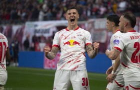 看台上,凯恩呆立的身影与疯狂庆祝的莱比锡...
